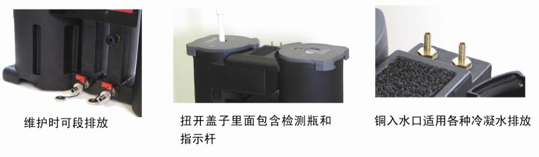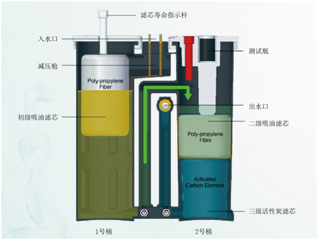 第一级是白色的吸油滤芯,该滤芯自然地浮于液面之上。冷凝水流经白滤芯,其中的油份被吸收,滤芯随着吸油数量的增多而逐渐变重,并自然缓慢地向1号罐底部下沉. 1号罐上的指示杆会提示您更换滤芯.
