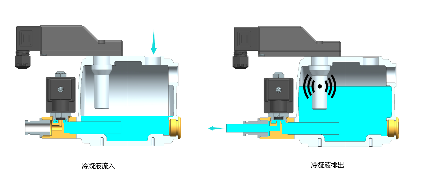 ◆ 当水位升到感应点时,传感器发出信号,电磁阀打开,开始排放冷凝水;