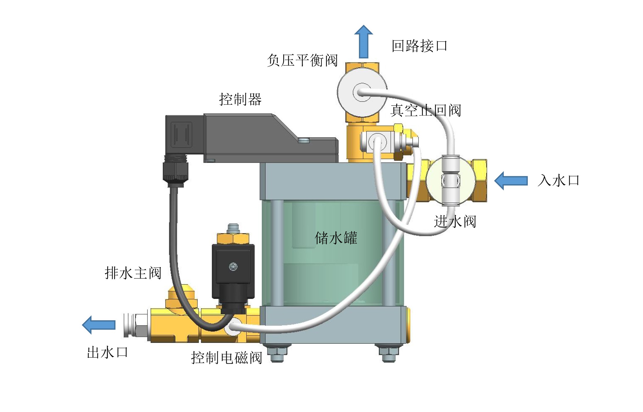 当水位升高到传感器感应点时,控制器发出信号,控制电磁阀通电,进水阀和负压平衡阀关闭,储水罐与真空系统隔离,同时外部压缩空气进入储水罐,排水主阀打开,开始排水;