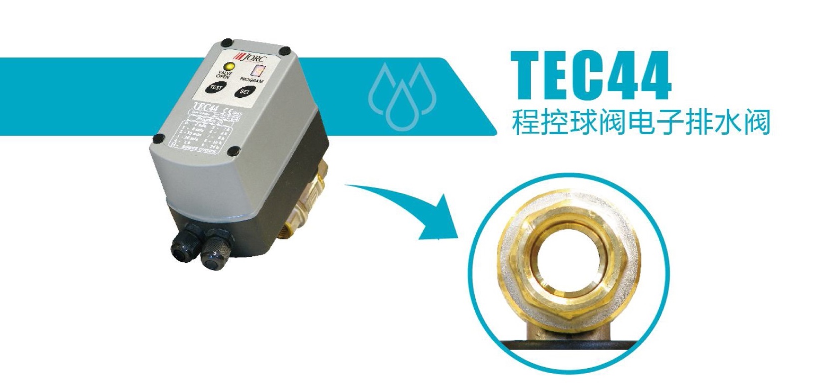 TEC44是荷兰JORC公司原产的微处理器编程控制的电动球阀,可排放含固体颗粒物的较脏冷 凝水和含油多的高粘度冷凝水,亦可用于冷凝水排量很大的场合。主要适用于储气罐、高效除油气、潮解式干燥机、大容量冷干机等。通过液晶显示,可选择十种间 隔程序和十种排放程序,并配有开阀指示灯、测试按钮、防堵系统及防停电备用电池包。电池:TEC44配备停电保护装置,装四节0.5伏的五号电池即可。