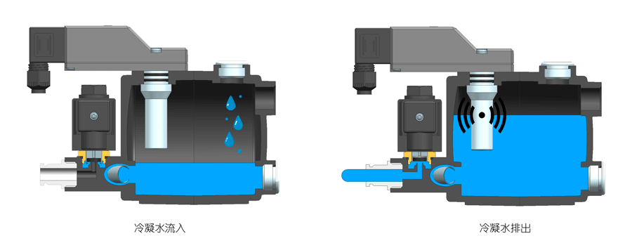 ◆ 当水位升到感应点时,传感器发出信号,电磁阀打开,开始排放冷凝水;
