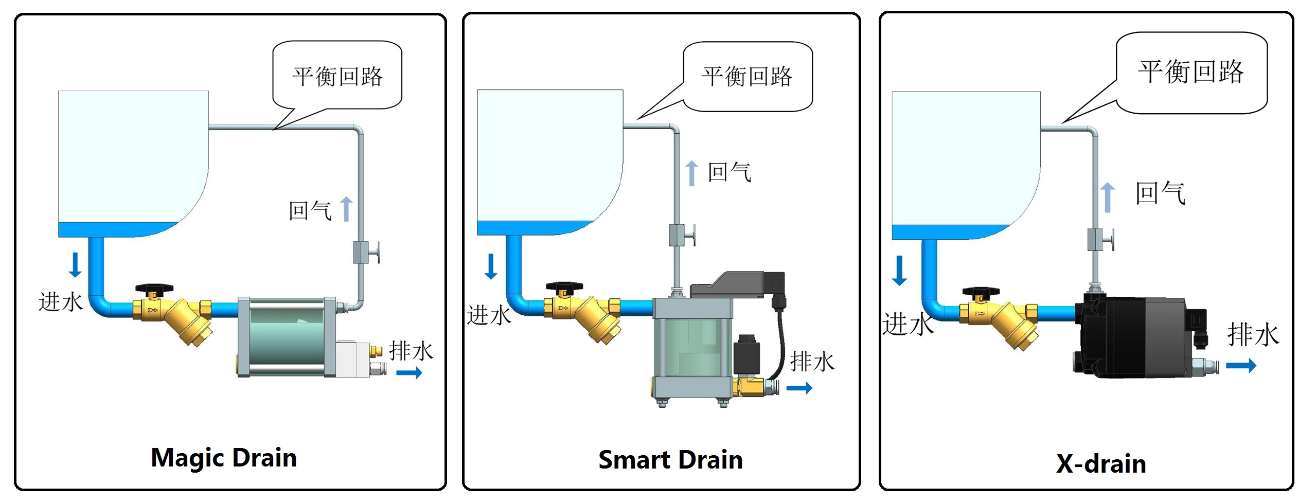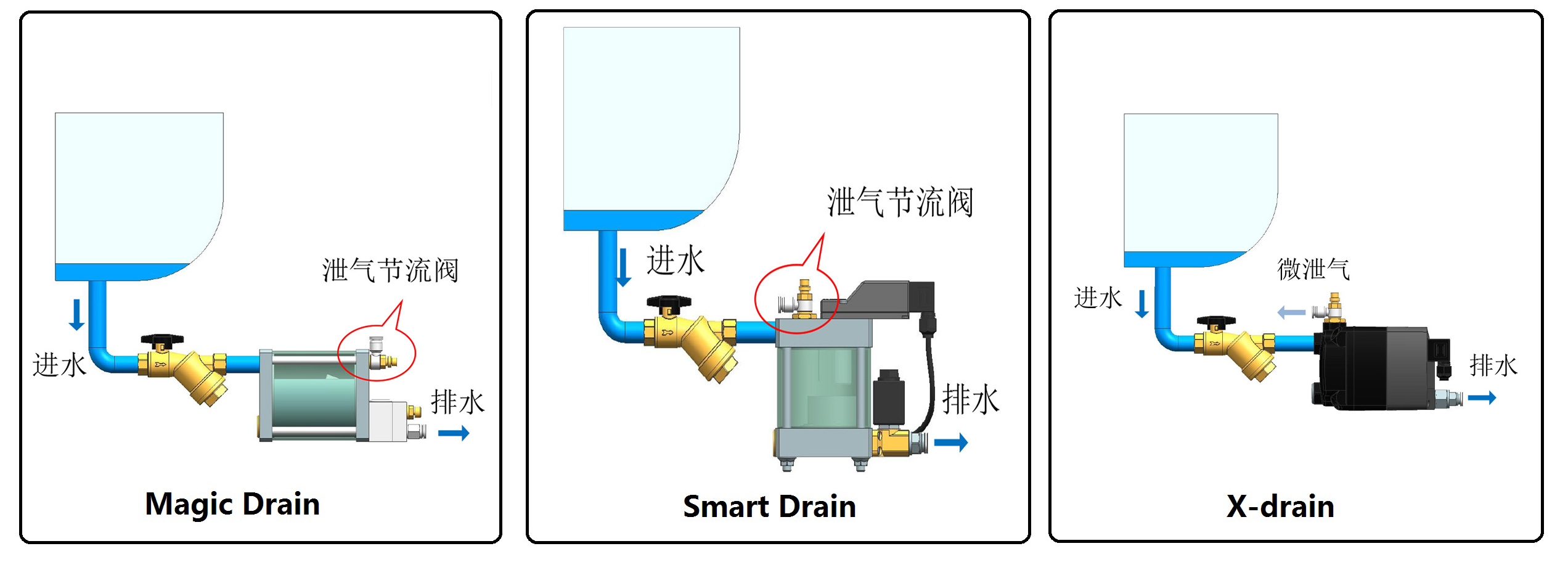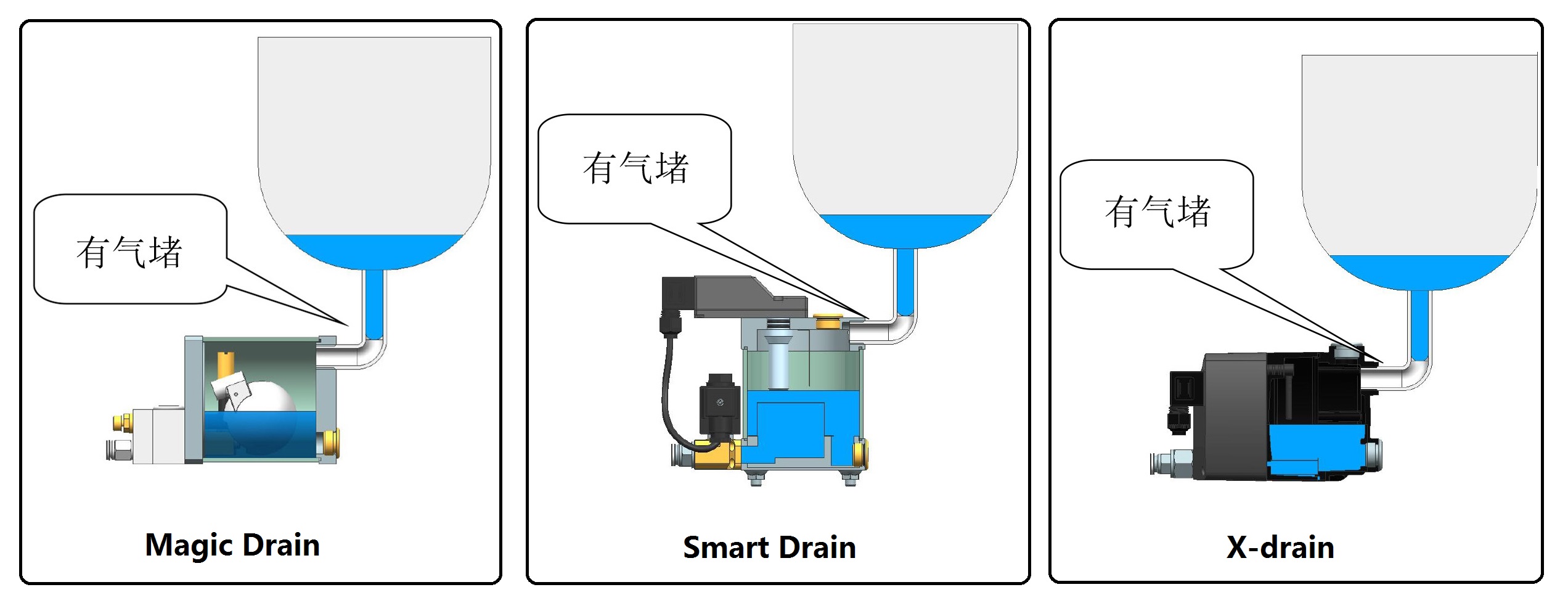 排水器在安装使用过程中最常遇到的问题就是冷凝水无法进入储水罐,其主要原因是气堵。